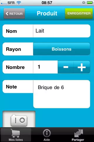 – You can define the name, the number of products, its unit (Kg, L, …) insert a note, add a photo and classify it in a department